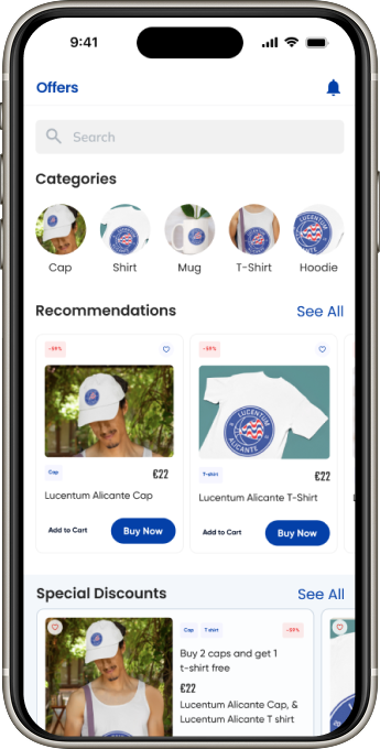 The Lucentum Basketball Fans App is a one-stop platform for basketball enthusiasts, offering everything they need to stay connected with their favorite team. Fans can log in to buy tickets, explore match schedules, check results, and read exclusive blogs. The app also features special discounts, merchandise like shirts and caps, and the ability to favorite teams for a personalized experience.